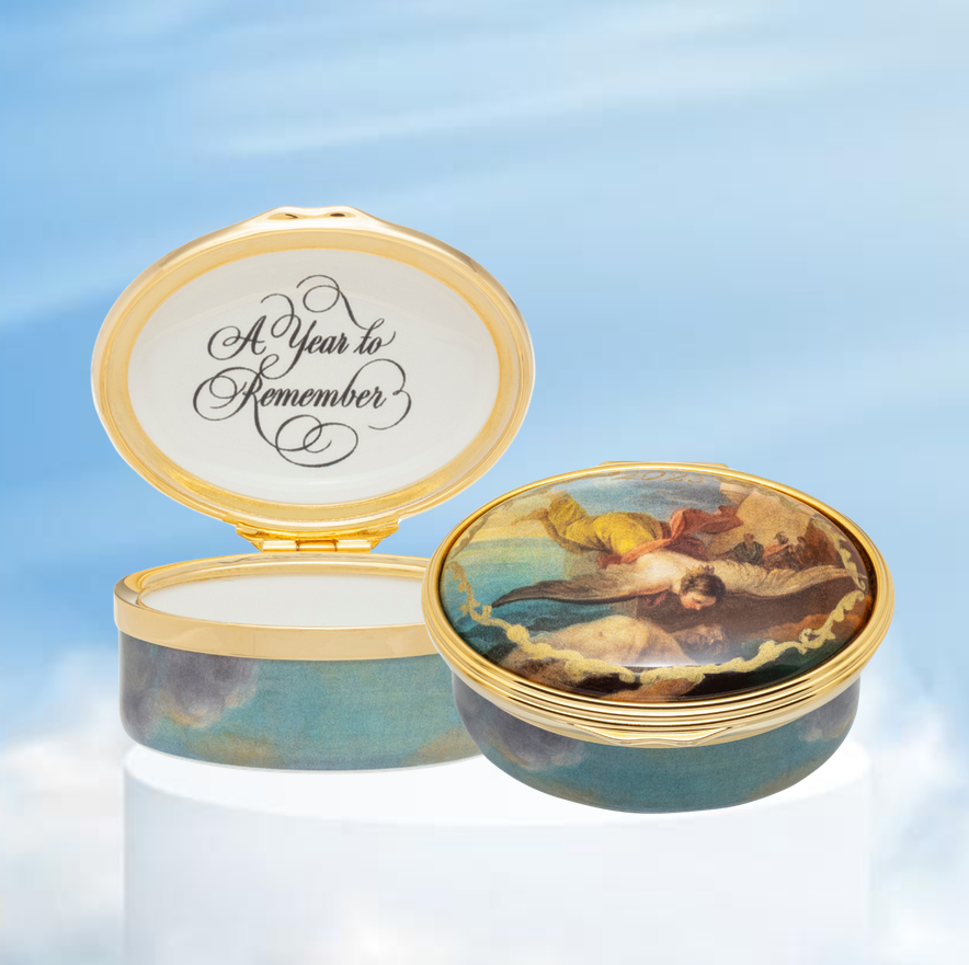 The lid of this box depicts Alcyone swooping down over her beloved Ceyx. This box has been beautifully handcrafted in England by our Halcyon Days artisans and is the 49th edition of this cherished annual tradition.