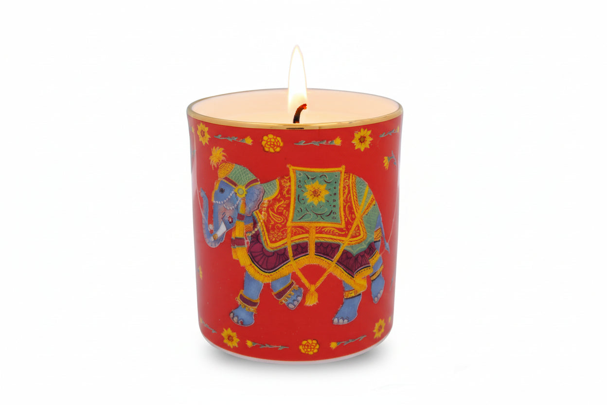 This beautiful unlidded Candle features our Ceremonial Indian Elephant design on a bold red background.