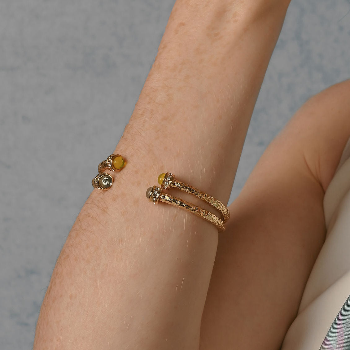 This Hammered Torque bangle has an eye-catching, irregular texture and boasts elegant pearl cabochons at either end.