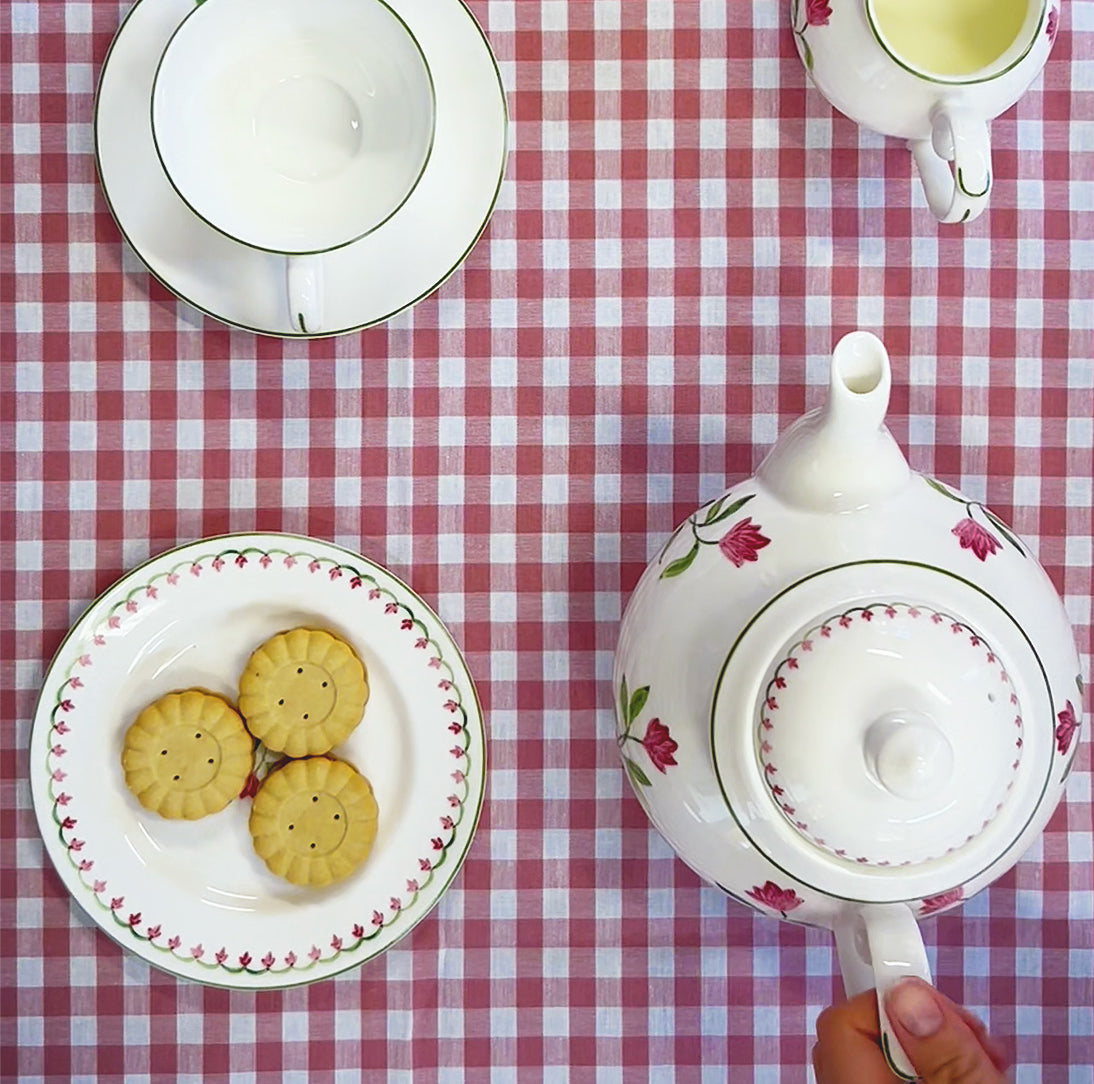The Marguerite Pink Teapot is a beautifully handcrafted piece, perfect for serving tea with elegance and charm. Part of the Marguerite Collection, it is inspired by Nina’s love of nature. Set upon English fine bone china, entirely handcrafted in Stoke-on-Trent, England, the delicate floral illustrations evoke fond memories of dining al fresco on sultry summer afternoons. With its graceful shape and timeless design, this teapot is a stunning centerpiece for any tea service.