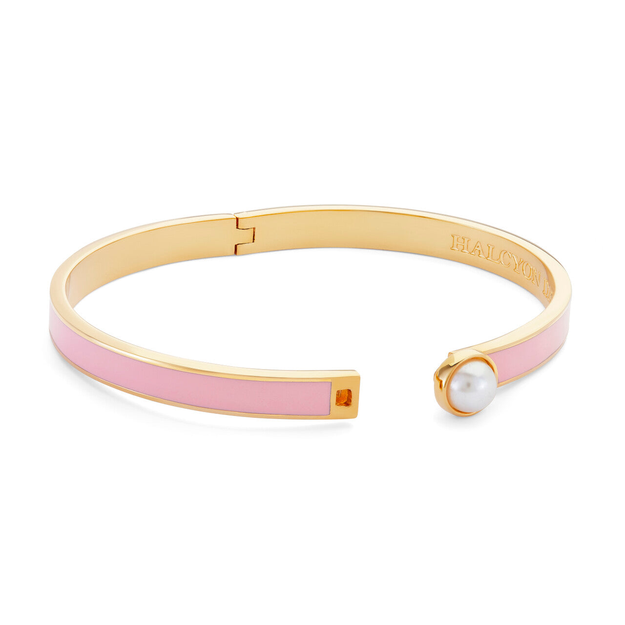 This 6mm bangle features 18ct gold plating, a pink enamel base and a cabochon pearl embossed on the hinged clasp.