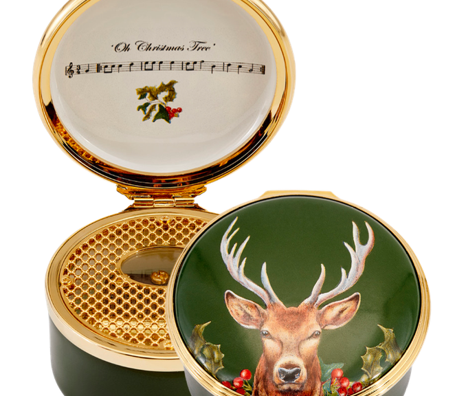 Celebrate the splendor of the season with the majestic Stag Musical Box, a stunning masterpiece of craftsmanship and design. Featuring the noble head of a stag proudly displayed on the front, this elegant music box exudes sophistication and festive grandeur, playing the carol 'Oh Christmas Tree' when opened. It is a magical piece that is the perfect addition to any collector or makes a one of a kind gift.