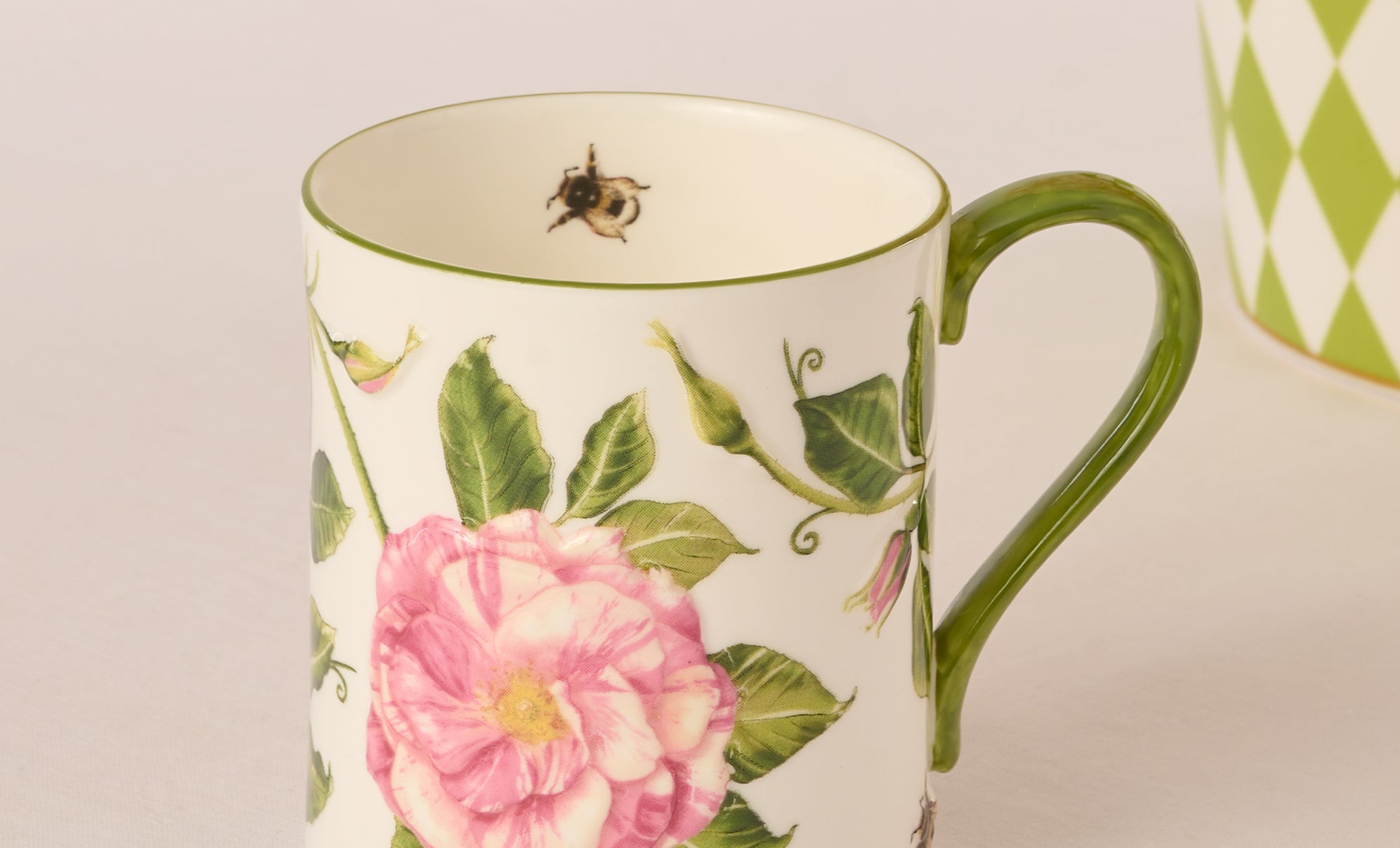 The King’s Rose Princess Mug is a fresh, distinctive take on a classic shape and design. Each mug has been modelled by hand by one of the last remaining ceramic modellers in the United Kingdom, giving exceptional depth and detail to the verdant green leaves, delicate golden bees and soft pink rosebuds and petals that adorn its surface. This intricate embossing, combined with hand-applied rose detailing makes this piece both distinctive and highly collectible.
