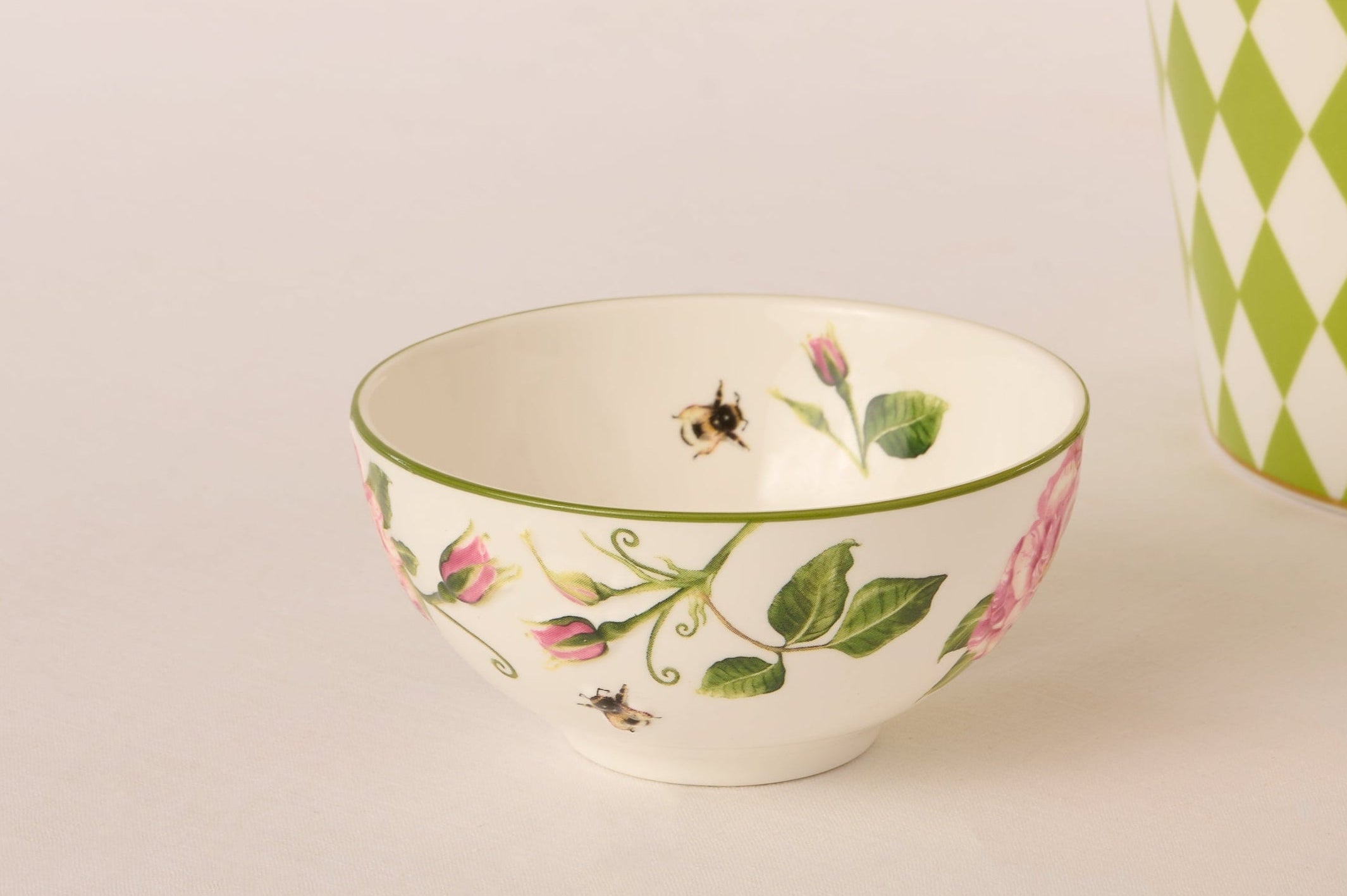 The King’s Rose Small Bowl is a fresh, distinctive take on a classic shape and design. Each bowl has been modelled by hand by one of the last remaining ceramic modellers in the United Kingdom, giving exceptional depth and detail to the verdant green leaves, delicate golden bees and soft pink rosebuds and petals that adorn its surface. This intricate embossing, combined with hand-applied rose detailing makes this piece both distinctive and highly collectible.