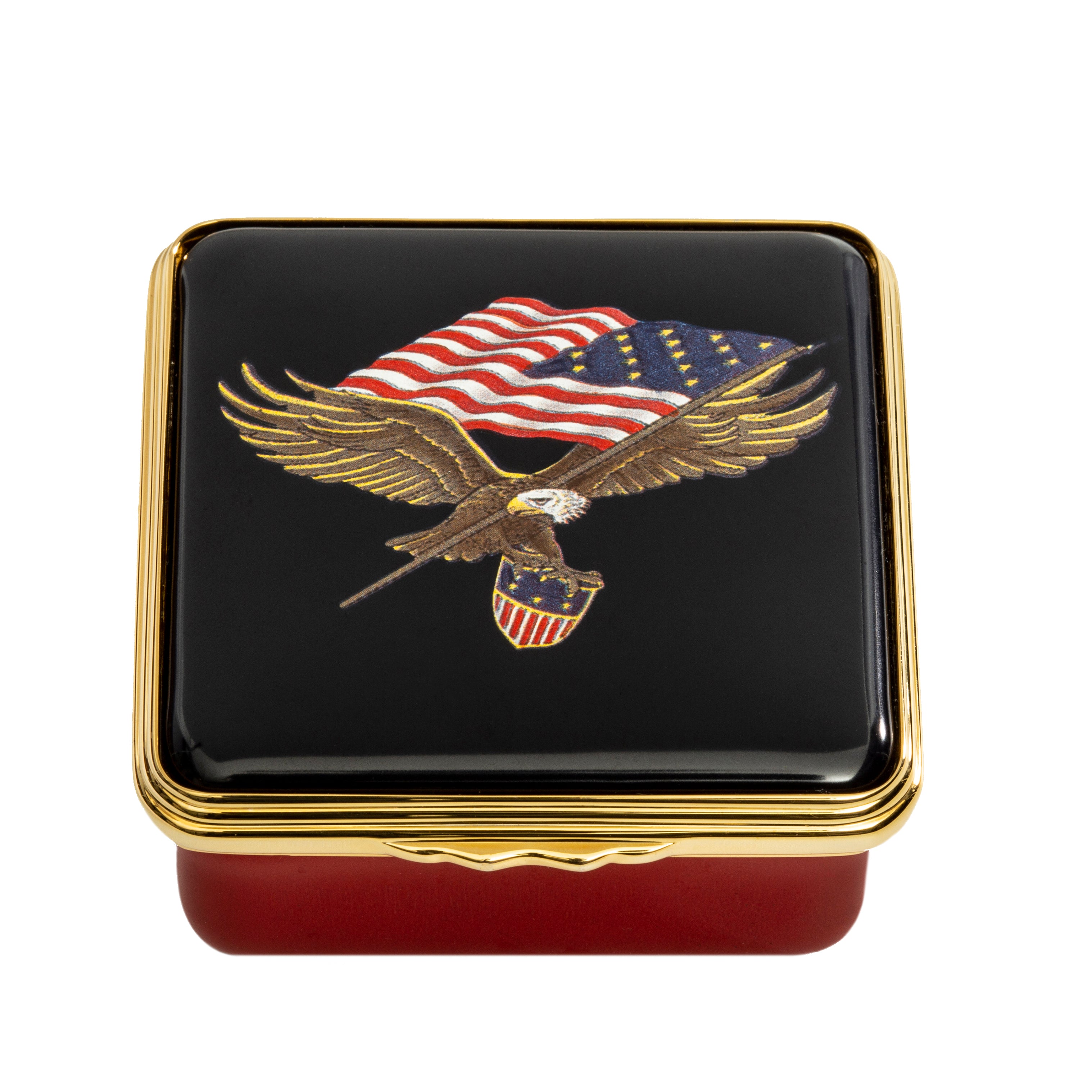 The Star Spangled Banner Box is an elegant homage to the beloved national anthem of the United States of America. Crafted with a deep blue enamel lid and adorned with the American Eagle, this box may be personalised with a message. An ideal way to show respect and gratitude to those who have served in the armed forces.