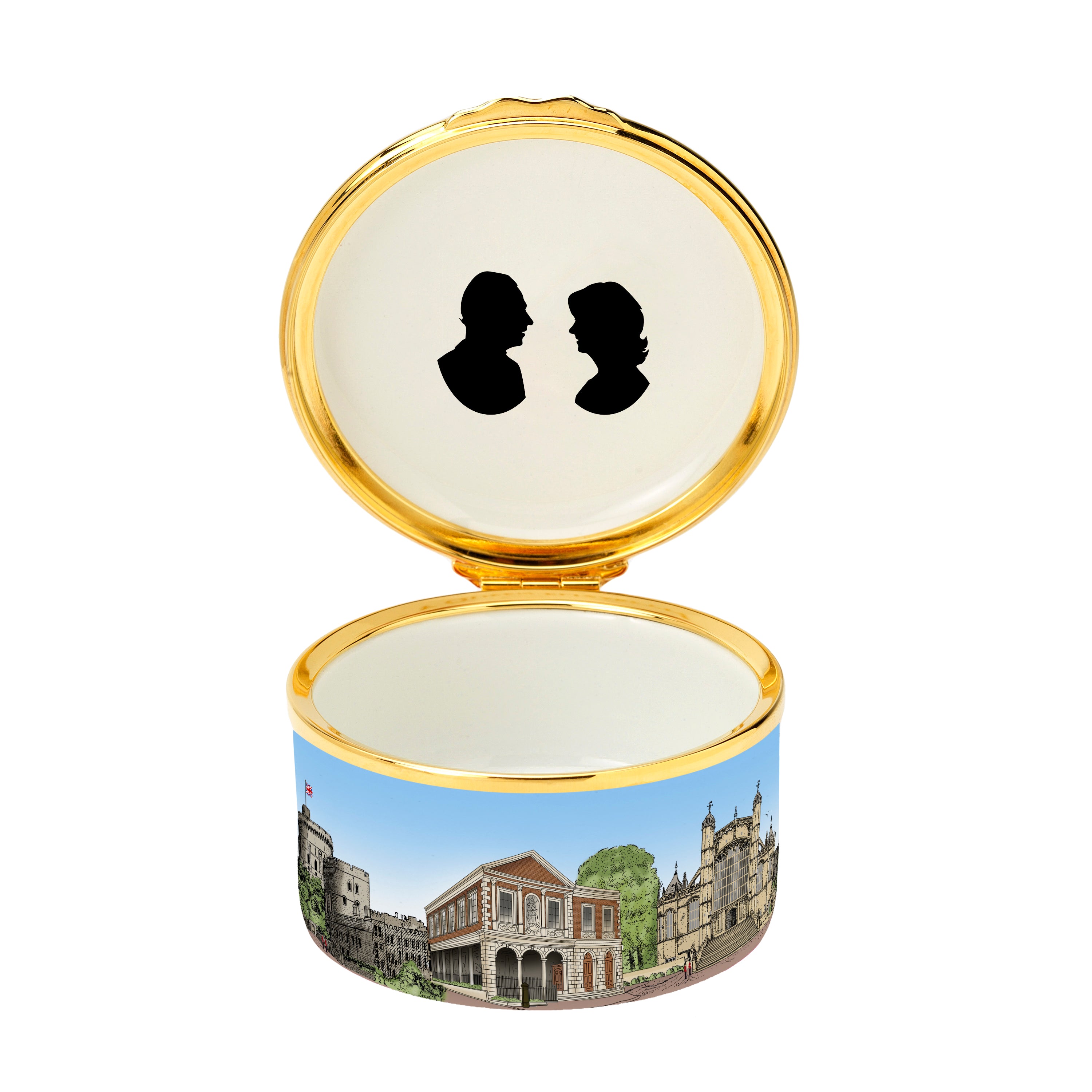 The base of the box beautifully captures the essence of their wedding day, intertwining the romance and history of Windsor's most beloved landmarks. Each carefully chosen location is steeped in tradition and significance, not only to Their Majesties but to the Royal family, who have cherished these places for centuries. The Windsor Guildhall, where they exchanged vows, echoes with the joy of countless celebrations. St George's Chapel, where they received their blessing, is a sanctuary of royal devotion, its hallowed walls bearing witness to generations of love and commitment. And of course, Windsor Castle, a timeless symbol of royal legacy and affection, stands as a proud testament to the enduring bond between monarchy and these treasured places.